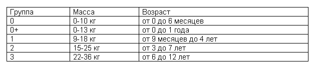 Чтобы облегчить родителям задачу производители разделили все кресла на несколько групп. Ниже приведена таблица, которая поможет, зная вес и возраст малыша, подобрать ему подходящее автокресло.
