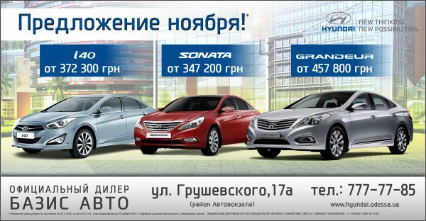 Специальное предложение в ноябре от официального дилера Hyundai компании БАЗИС АВТО! Деловая красота Hyundai i40, Hyundai Sonata, Grandeur по деловым ценам!