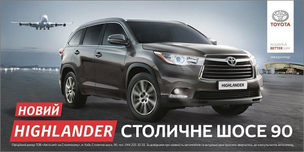 Завітайте на прем’єрний тест-драйв нового Toyota Highlander з 29 березня по 6 квітня 2014 року в автосалоні офіційного дилера Тойота Центр Київ «Автосаміт на Столичному» на території України.