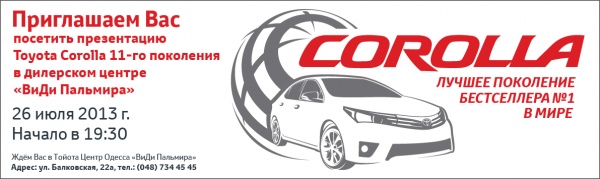 Приглашаем всех желающих посетить торжественную презентацию Toyota Corolla 11-го поколения, которая состоится 26 июля 2013 г. в Тойота Центр Одесса «ВиДи Пальмира». Приходите и встречайте с нами лучшее поколение самого популярного автомобиля в мире!.