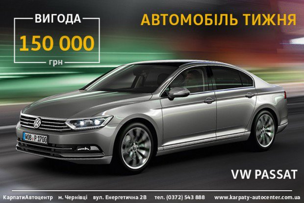 Лише протягом 7 днів Ви маєте можливість скористатись акцією автомобіль тижня і стати власником преміального VW Passat із вигодою 150 000грн.