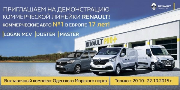 В период с 20 - 22 октября 2015 года, на территории выставочного комплекса морского вокзала, Автоцентр RENAULT представит ряд автомобилей для профессиональной деятельности: коммерческие автомобили Renault, а также трансформируемые модели.