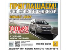 Официальный дилер RENAULT в Одесском регионе компания ООО«АВТО ГРУП+» приглашает всех поклонников RENAULT посетить ДНИ ОТКРЫТЫХ ДВЕРЕЙ, посвященные RENAULTLODGY нового поколения, которые пройдут с 17 по 18 августа 2013 года, в автосалоне RENAULT на пр-т.М. Жукова,6А.