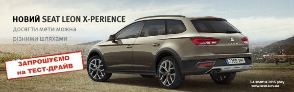 Если Вы еще не успели познакомиться с новым Leon X-Perience, приглашаем на пробную поездку 3-4 октября 2015 года в автосалон SEAT на Нивках.