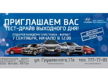 Официальный дилер HYUNDAI в Одесском регионе Автоцентр ОДЕССА ООО «БАЗИС АВТО», приглашает всех поклонников HYUNDAI принять участие в ТЕСТ-ДРАЙВЕ ВЫХОДНОГО ДНЯ, который будет проходить в автосалоне на Грушевского 17А, 7 сентября 2013 года!.