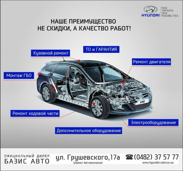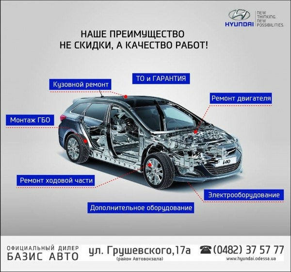 Сервисный центр HYUNDAI компании БАЗИС АВТО более 17 лет успешно работает на Одесском автомобильном рынке и является безусловным лидером в сфере предоставления качественных услуг по сервисному обслуживанию и ремонту автомобилей Hyundai.