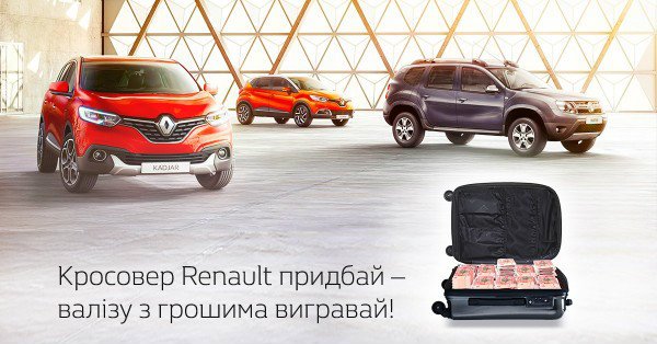 В этом месяце мы предлагаем Вам приобрести один из кроссоверов RENAULT (Captur, Kadjar, Koleos, Duster) и принять участие в розыгрыше одного из трех чемоданов с деньгами: