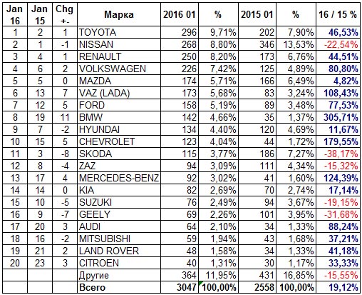 В целом, продажи новых легковых автомобилей в январе 2016 года выросли на 23% по сравнению с тем же месяцем 2015 года. Лидером продаж января текущего года стала Toyota с показателем 303 автомобиля (+68% в сравнении с январем 2015). Второе место отвоевал Nissan (282 авто), а замыкает тройку Renault (261 авто).