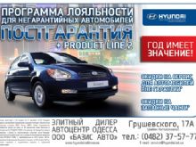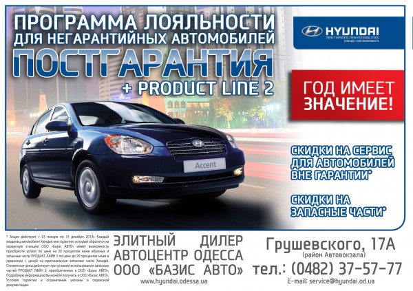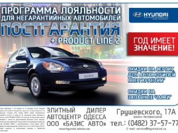 * Акция действует с 3 января по 31 декабря 2013г. Каждый владелец автомобиля Hyundai вне гарантии, который обратится на сервисную станцию ООО «Базис АВТО» имеет возможность приобрести услуги по цене на 20 процентов ниже обычных и запасные части PRODUCT LINE 2 по цене до 20 процентов ниже в сравнении с ценой на оригинальные запасные части Hyundai. Сниженные цены действуют при условии использования запасных частей PRODUCT LINE 2, приобретенных в ООО «Базис АВТО». Условия гарантии и ограничения указаны в сервисной документации.