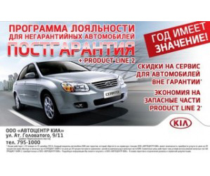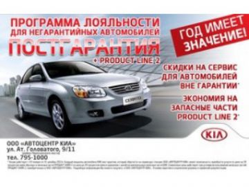 С 3 января 2013 года на Сервисной Станции ООО «АВТОЦЕНТР КИА» действует программа лояльности для негарантийных авто «Постгарантия + Product Line 2» - скидки на сервисное обслуживание** и экономия на запчасти*!!!.