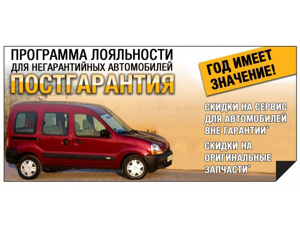 С 3 января 2013 года на Сервисном Центре Renault действует программа лояльности для негарантийных авто «Постгарантия» - скидки на сервисное обслуживание** и на оригинальные запчасти*!!!.