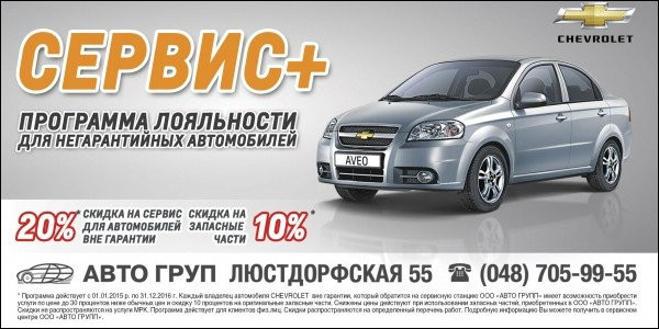 *Предложение действует с 1.01 по 31.12.2016г. Каждый владелец автомобиля CHEVROLET вне гарантии, который обратится в сервисный центр ”АВТО ГРУПП”