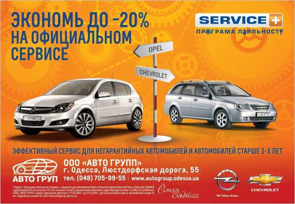 ** Программа лояльности «Сервис +» действует для автомобилей Opel, Chevrolet с добавлением 8% (на услуги) и 13% (на запасные части) к накопленной клиентом в существующей системе «CarMan @ CarWoman» и ООО «АВТО ГРУПП» скидок. Программа действует с 17.03.2014 г. до 31.12.2014 г. для негарантийных авто и автомобилей старше 3х лет. Подробные условия у менеджеров СЦ АВТО ГРУП.