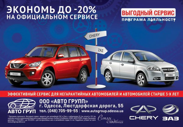 ** Программа лояльности ВЫГОДНЫЙ СЕРВИС действует для автомобилей ZAZ, Chery с добавлением 8% (на услуги) и 13% (на запасные части) к накопленной клиентом в существующей системе «CarMan @ CarWoman» и ООО «АВТО ГРУПП» скидок. Программа действует с 17.03.2014 г. до 31.12.2014 г. для негарантийных авто и автомобилей старше 3х лет. Подробные условия у менеджеров СЦ АВТО ГРУП.