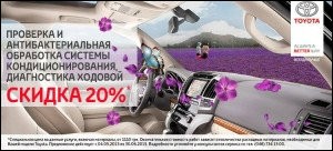 Тойота Центр Одесса «ВиДи Пальмира» напоминает водителям о необходимости проведения очистки и обеззараживания автомобильных систем кондиционирования накануне жаркого летнего периода. Тем более что с 4 мая по 30 июня 2015 года Вы сможете провести данные процедуры со скидкой 20%!