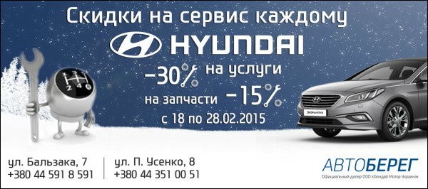 В честь наступающего Нового Года компания "Автоберег" объявляет о старке скидок на сервисное обслуживание и запчасти на СТО. C 18 по 28 февраля 2015 г., при посещении станции технического обслуживания компании "Автоберег", каждый владелец автомобиля HYUNDAI имеет возможность получить скидку -30% на работы и -15% на запчасти! Подробнее в автоцентрах HYUNDAI компании "Автоберег" по адресу: ул. Бальзака 7 и ул. П. Усенко 8.