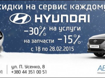 В честь наступающего Нового Года компания "Автоберег" объявляет о старке скидок на сервисное обслуживание и запчасти на СТО. C 18 по 28 февраля 2015 г., при посещении станции технического обслуживания компании "Автоберег", каждый владелец автомобиля HYUNDAI имеет возможность получить скидку -30% на работы и -15% на запчасти! Подробнее в автоцентрах HYUNDAI компании "Автоберег" по адресу: ул. Бальзака 7 и ул. П. Усенко 8.