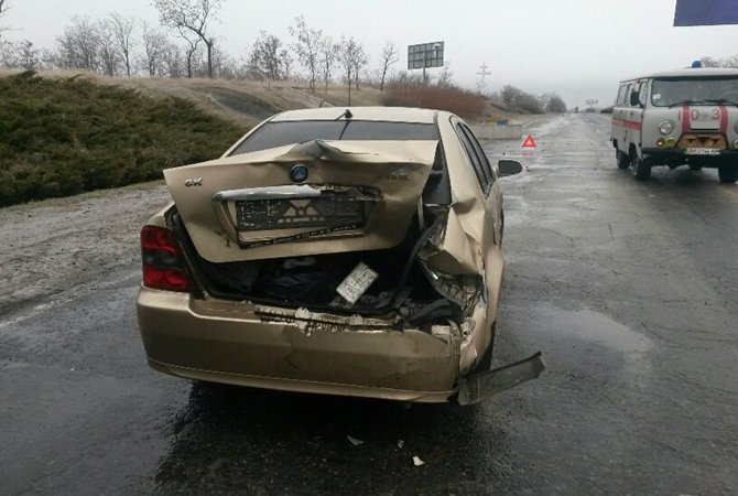 Первое ДТП случилось неподалеку от блокпоста около указателя "Мариуполь" - на скользком асфальте даму за рулем "Джили" понесло прямо на микроавтобус с военными. И гражданские и бойцы отделались легким испугом.
