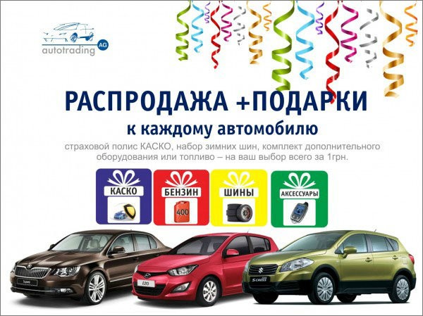 Компания АВТОТРЕЙДИНГ на 6км объявляет уникальную распродажу автомобилей Skoda, Hyundai, Suzuki. Приобретая автомобиль по акционной цене, вы гарантированно получаете страховой полис КАСКО, набор зимних шин, комплект дополнительного оборудования или топливо – на ваш выбор всего за 1грн.