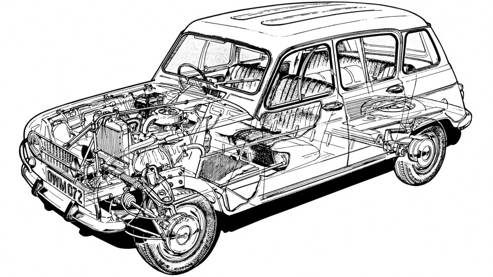 Секрет успеха всех этим машин - дешевизна и неприхотливость. Renault 4 имел типичную для французских переднеприводных автомобилей тех лет компоновку с продольно расположенным двигателем и пристыкованной к нему спереди коробкой передач, к которой сверху над двигателем из салона тянулась длинная тяга рычага переключения ступеней. Такое расположение коробки не помешало фирме Sinpar сделать полноприводную версию Renault 4: трансмиссию пришлось пускать под днищем и менять расположение бензобака. То есть у Renault 4, по сути, была кросс-версия, а ещё версия кабриолет и развозной «каблучок».