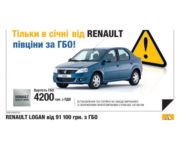 Только с 13 по 31 января 2012 года предоставляется скидка в размере 4 200 грн. с НДС на покупку Renault Logan с ГБО (то есть скидка составляет 50% стоимости ГБО, установленного на заводе) на автомобили 2011 года выпуска при условии наличия у дилеров на складе.