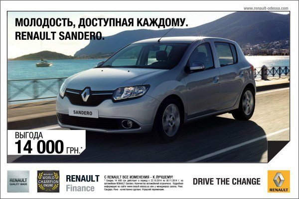 * Скидка 14 000 грн действует в период с 22.10.2014 по 30.11.2014 г. на автомобили RENAULT Sandero. Количество автомобилей ограничено.