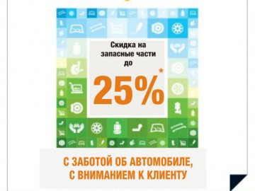 до 25% на запасные части группы ТО при прохождении регламентного ТОдо 10% на запасные части подвески и тормозной системы (скидка предоставляется клиенту, если во время проведения регулярного ТО была выявлена необходимость замены этих запасных частей).