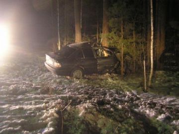ДТП произошло на ровном участке дороги. Автомобиль съехал на обочину и врезался в сосну.