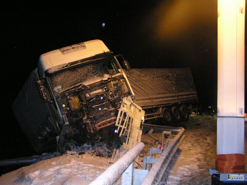 58-летний водитель автомобиля Subaru Impreza, житель г. Киев, двигаясь со стороны г. Сарны в направлении г. Киев, не справился с управлением, не учел дорожную обстановку, выехал на полосу встречного движения и допустил столкновение с грузовым автомобилем IVECO EUROSTAR с полуприцепом SCHMITZ SPR 24, который двигался во встречном направлении. Столкновение двух автомобилей произошло на мосту реки Лев.