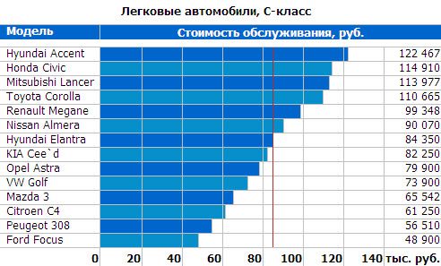 Интересно, что самая низкая стоимость обслуживания – у французских автомобилей группы PSA. Только в нескольких сегментах Peugeot и Citroen уступают лидерство по доступности техобслуживания Ford. В частности, в сегменте B средняя суммарная стоимость ТО Citroen на пробеге 140-150 тыс. км на 69% ниже среднего уровня по сегменту (78 159 руб.), Peugeot – ниже на 49,2%. В С-классе средняя суммарная стоимость ТО составила 85 тыс. руб. При этом суммарная стоимость ТО Ford на пробеге 140-150 тыс. км примерно на 75% ниже средней, Peugeot – ниже на 52%, Citroen – ниже примерно на 40%. Средняя суммарная стоимость ТО в D-классе по всем исследуемым маркам составила около 97 тыс. руб.