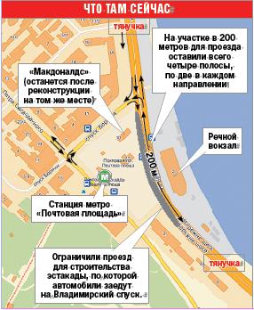 Собственно, перекрыли участок всего метров 200 - от перекрестка  набережной и Боричева Тока в сторону памятника Магдебургскому праву (см. схему). Но и этого хватило для транспортного коллапса: сработал так называемый эффект бутылочного горлышка, когда три полосы у светофора сужаются до двух.