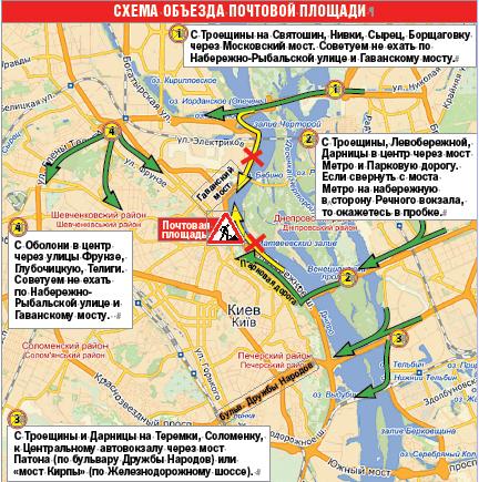 Другая проблема - это транзитный транспорт. Киевские водители о реконструкции развязки знают, а вот дальнобойщики наверняка даже не слышали. И все, вероятно, поедут через Почтовую площадь, еще усугубив ситуацию. С началом учебного сезона и возвращения киевлян из отпусков можно прогнозировать максимальные пробки на площади. Так что пользуйтесь нашей схемой и объезжайте это место.