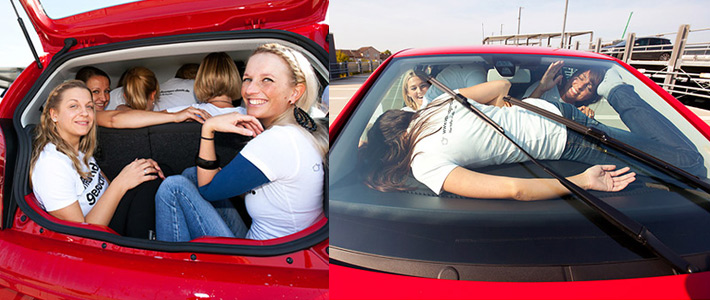 Всего в машину поместились 16 человек: семь находились на задних сиденьях, четверо на передних креслах, один на передней панели, двое на полу и двое в багажнике. Им было нужно закрыть все двери и окна, завести двигатель и просидеть в салоне в течение десяти секунд - ровно столько необходимо, чтобы достижение было официально признано Книгой рекордов Гиннесса.