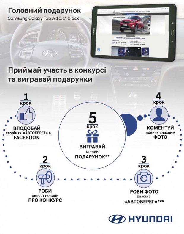 При купівлі будь-якої моделі Hyundai в офіційному дилерському центрі «Автоберег» Клієнт отримує можливість стати Власником головного подарунку - Samsung Galaxy Tab. Учасником розіграшу головного подарунку Samsung Galaxy Tab A 10.1" Black стає кожен, хто придбає автомобіль HYUNDAI в ТОВ "Автоберег" в період проведення Акції.