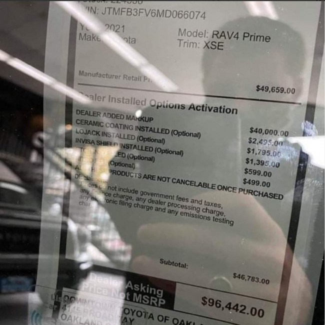 Топовый гибрид Toyota RAV4 Prime стоит 96 422 доллара, и это не шутка. Именно такую цену выставил один из дилеров марки, сообщает .