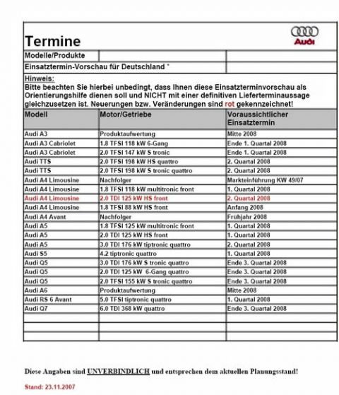 В нем детально расписан запуск новых моделей на следующий год. Например, весной 2008 года на рынке появится A4 Avant, а осенью поступят в продажу новый кроссовер Q5 и мощная версия Q7 V12 TDI.