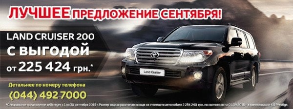 Toyota Land Cruiser 200 с выгодой от 225 424 грн.* с 1 по 30 сентября 2015 года!.