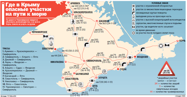 В разгар курортного сезона в Крыму автомобилей на дорогах традиционно прибавилось: многие туристы предпочитают свои четыре колеса поездам, на которые билеты днем с огнем не сыскать, да и сами жители полуострова на выходных часто ездят к морю. Однако путь между городами куда сложнее, чем привычные дороги населенных пунктов. Сотрудники Крымской госавтоинспекции помогли составить карту коварных трасс полуострова, чтобы помочь новичкам, сообщает .