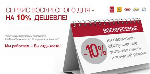 Воспользуетесь акционным предложением «Сервис воскресного дня - на 10% дешевле!» и гарантировано получите скидку на сервисное обслуживание, запасные части и текущий ремонт в размере 10%!*