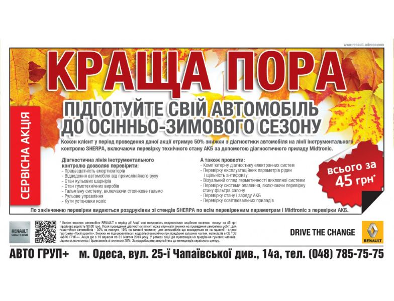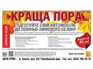 А Вы уже подготовили свой автомобиль к осенне-зимнему сезону? Не теряйте время-приезжайте! В сервисном центре ООО «АВТО ГРУП+» действует лучшее предложение по подготовке автомобиля RENAULT к осенне-зимнему сезону!.