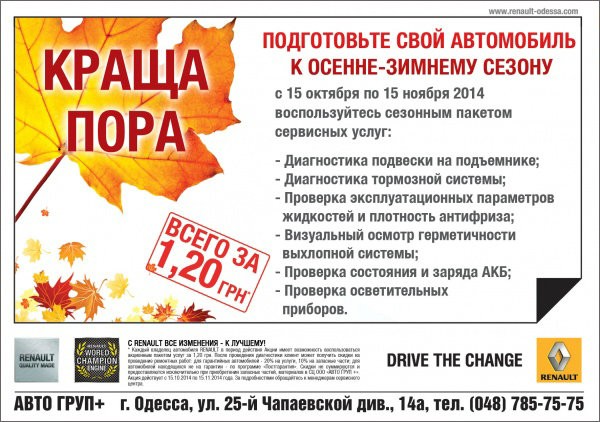 Не теряйте время – приезжайте! В сервисном центре СЦ ООО «АВТО ГУП+» действует лучшее предложение по подготовке автомобиля RENAULT к осенне-зимнему сезону!