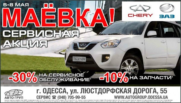 Каждый владелец автомобиля ЗАЗ, CHERY, при проведении работ по ТО, ТР на СЦ ООО «АВТО ГРУПП» в период с 5 по 8 мая 2014 года, получает право на получение скидки в размере 30% на услуги сервиса и 10% на запасные части.