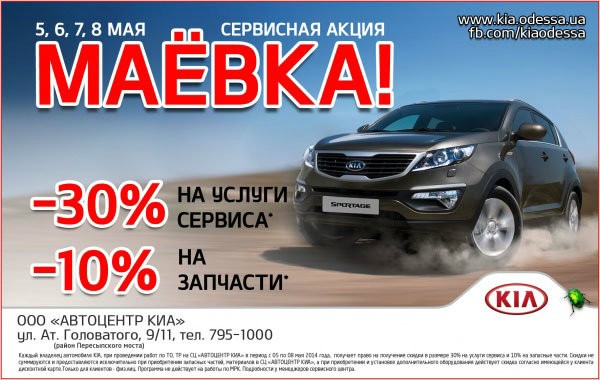 Каждый владелец гарантийного автомобиля KIA, при проведении работ по ТО, ТР на СЦ ООО «АВТОЦЕНТР КИА» в период с 5 по 8 мая 2014 года, получает скидку в размере 30% на услуги сервиса и 10% на запасные части.