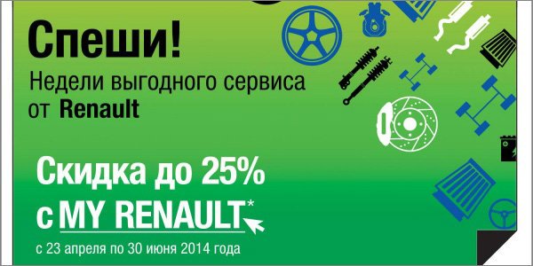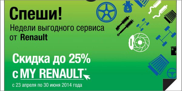 * Скидка до 25% на запасные части, необходимые для проведения периодического технического осмотра, предоставляется при условии регистрации в разделе My Renault на сайте renault.ua Клиентам, которые не зарегистрировались в разделе My Renault, предоставляется скидка до 20%. Предложение действует с 23.04.2014 по 30.06.2014 года.