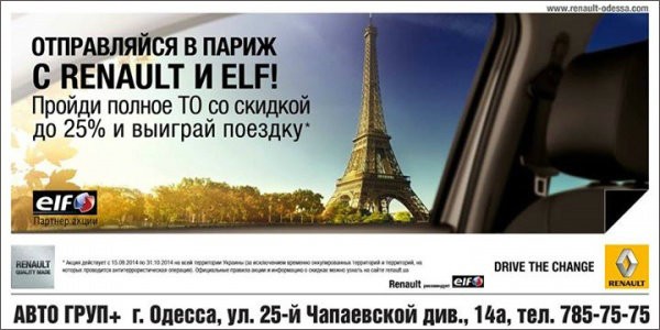 С 15 сентября по 31 октября 2014 года проходит акция «Отправляйся в Париж с Renault и Elf». Воспользуйтесь уникальным сервисным предложением, чтобы подготовить Ваш автомобиль к осеннему периоду, а также принять участие в розыгрыше ценных призов