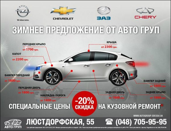 *Только для клиентов - физ.лиц. Скидка 20% предоставляется на производимые работы и не суммируются, предоставляются исключительно при приобретении запасных частей, материалов в СЦ ООО «АВТО ГРУПП».Предложение действует с 8.01 до 28.02.2015 года.