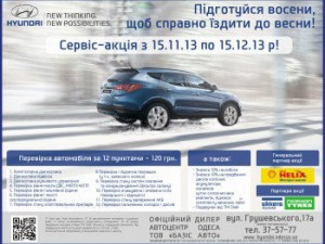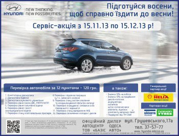 Как известно, 12 – магическое число, и мы предлагает Вам ощутить его волшебство. С 15 ноября по 15 декабря проходит сервис-акция, в рамках которой любой владелец автомобиля Hyundai может провести проверку своего авто по 12 пунктам за 120 гривен.