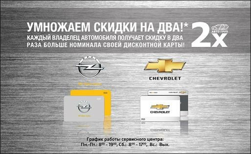 Только в период с 8 января по 28 февраля 2015 года, каждый владелец автомобиля Opel, Chevrolet посетив официальный сервисный центр АВТО ГРУП и предъявив дисконтную карту любого официального дилера, в т.ч. СЦ АВТО ГРУП, получает удвоенную скидку на сервисное обслуживание своего автомобиля*!.