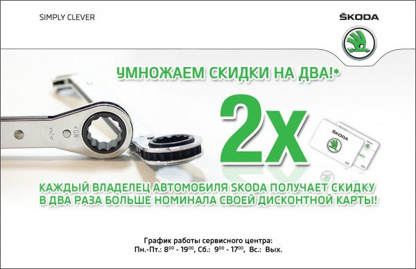 Только в период с 8 января по 28 февраля 2015 года, каждый владелец автомобиля Skoda, посетив официальный сервисный центр АВТОЦЕНТР ОДЕССА и предъявив дисконтную карту любого официального дилера, в т.ч. СЦ АВТОЦЕНТР ОДЕССА, получает удвоенную скидку на сервисное обслуживание своего автомобиля*!