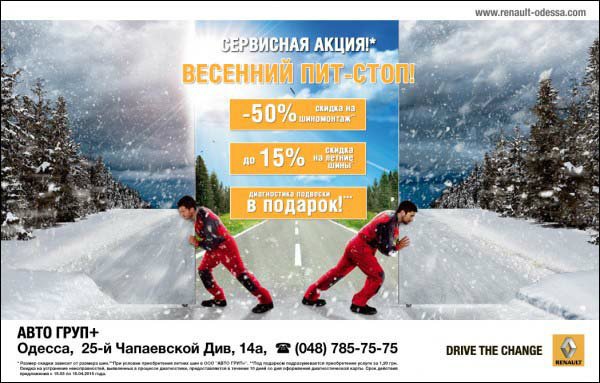 В рамках акции «ВЕСЕННИЙ ПИТ-СТОП», до 15 апреля 2015 года, каждый клиент, владелец автомобиля RENAULT, получает право на проведение диагностики подвески автомобиля в подарок*** и шиномонтаж со скидкой 50%**, при условии приобретения комплекта летних шин со скидкой до 15 %.*